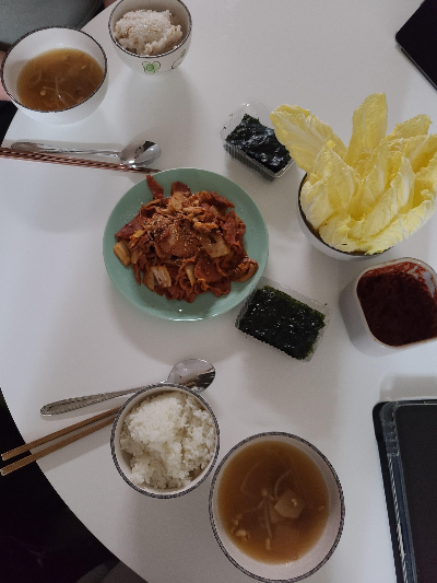 이번 요리는 시원한 김치콩나물국에 기사식당표 제육볶음입니다. 이번에 만드는 제육볶음은 보통 고추장 넣어서 하시는 경우를 많이 봤고 제 친구도 고추장을 넣어서 만드는 걸로 알고 있습니다. 그런데 이 레시피는 고춧가루만 사용해서 텁텁하지 않고 깔끔해서 개인적으로는 제 취향이었습니다. 제육볶음은 삼시 세끼에서 차승원 님의 레시피를 보고 만들었으니 참고 부탁드립니다. 그리고 저는 이상하게 콩나물 쓰는 요리를 자주 망치는 편입니다. 이상하게 잘 망하더라고요, 그래서 조금 더 신경 써서 하는 편입니다. 이번에는 다행히도 시원하게 국이 끓여져서 만족한 식사였습니다. 그러면 시원한 김치콩나물국과 제육볶음 한 끼 식사 요리방법입니다. 삼시세끼 제육볶음 재료로 돼지고기 800g, 진간장, 고춧가루, 물엿, 후추, 참기름, 다진 마늘, 양파, 소주를 준비합니다. 돼지고기를 간장 3스푼, 후추 조금, 다진 마늘 2스푼 넣고 잘 조물 거린 뒤 숙성시킨다. 양파의 껍질을 까서 강판에 갈거나 믹서기로 곱게 갈아준다. 간장 3스푼, 고춧가루 7스푼, 물엿 6스푼, 후추 살짝, 참기름 살짝, 다진 마늘 2스푼, 간양파 2스푼, 소주 1스푼을 섞어서 양념장을 만들고 마찬가지로 숙성시킨다. 양파를 채 썰어준다. 고추, 파를 송송 적당히 어슷 썰어준다. 밑간 한 고기가 30분~1시간 정도 숙성이 되었다면 기름을 둘러 프라이팬을 가열한다. 숙성된 고기를 어느 정도 볶고 적당히 익었다면 숙성된 양념장을 넣고 잘 섞어서 볶아줍니다. 양파, 고추, 파를 넣고 강한 불에 빠르게 볶아주면 제육볶음 완성입니다. 미리 준비한 알배추를 씻어서 그냥 싸 먹거나 밥에 쌈장을 넣어 싸 먹으면 맛있는 제육볶음 한쌈입니다. 이어서 김치콩나물국 재료로 잘 익은 신김치, 멸치육수팩, 꽃게육수팩, 조개육수팩, 파, 콩나물, 두부(선택사항), 국간장을 준비합니다. 육수팩, 파뿌리와 파를 넣고 푹 끓여줍니다. 신김치를 적당한 크기로 잘라줍니다. 국물이 푹 끓었다면 육수팩, 파뿌리를 건져냅니다. 자른 김치, 김치국물을 넣고 끓여줍니다. 다시 한번 끓기 시작하면 두부, 콩나물을 넣고 팍 끓여줍니다. 뚜껑을 덮은 경우 가급적 자주 열면 콩나물이 비려질 수 있으므로 열었다면 계속 열거나 계속 덮고 자주 열지 않도록 합니다. 물을 조금 더 넣고 충분히 끓어오르면 취향에 따라 국간장으로 간을 하고 조금 더 끓이면 완성입니다.