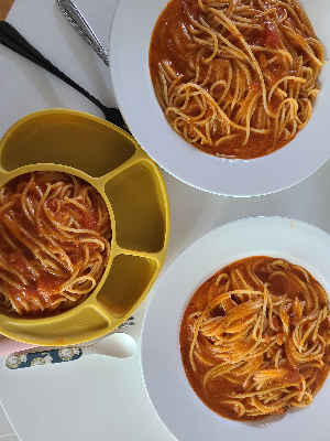 아기와 함께 먹을 수 있는 국물이 자작한 토마토스파게티 만들어보겠습니다. 토마토 스파게티 요리는 단 몇 단계만으로 준비할 수 있는 간단하면서도 맛있는 요리입니다. 클래식 토마토 스파게티를 만드는 단계별 가이드는 다음과 같습니다. 재료는 다음 재료들을 준비합니다. 스파게티 면(원하는 분량만큼), 다진 잘 익은 토마토 2-3개, 다진 마늘 3~4쪽, 잘게 다진 작은 양파 1개, 올리브유, 소금과 후추는 입맛에 맞게, 고춧가루 (옵션, 선택사항, 데우기용), 잘게 썬 신선한 바질 잎(선택 사항, 장식용), 간 파마산 치즈(옵션, 서빙용)를 준비합니다. 우선 큰 냄비에 소금물을 넣고 끓입니다. 스파게티 면을 끓는 물에 넣고 알단테(보통 8~10분 정도)까지 포장 설명에 따라 조리하세요. 들러붙는 것을 방지하기 위해 가끔 저어주세요. 다 익은 스파게티는 소쿠리에 담아 물기를 빼주세요. 나중에 사용할 수 있도록 파스타 물 약 1컵을 남겨두세요. 이어서 토마토소스를 만들어 줍니다. 큰 프라이팬이나 냄비에 올리브 오일 몇 스푼을 넣고 중간 불로 가열합니다. 뜨거운 기름에 다진 마늘을 넣고 타지 않도록 주의하면서 향이 날 때까지 1~2분 정도 볶습니다. 잘게 썬 양파를 프라이팬에 넣고 양파가 반투명하고 부드러워질 때까지 2~3분 더 조리합니다. 다음으로 잘게 썬 토마토를 프라이팬에 넣습니다. 소금, 후추, 고춧가루(사용하는 경우, 상황에 맞춰 사용, 아기용의 경우 최대한 적게)로 맛을 냅니다. 토마토가 분해되기 시작하고 주스가 나올 때까지 가끔씩 저어주면서 약 8-10분 동안 요리하여 걸쭉한 소스를 만듭니다. 소스가 너무 묽은 것 같으면 파스타 물을 조금 넣어서 묽게 만드세요. 소스를 맛보고 필요하면 양념을 조절하세요. 토마토가 너무 산성이면 설탕을 조금 더할 수도 있습니다. 토마토소스가 원하는 농도에 도달하면 익힌 스파게티 면을 프라이팬에 직접 넣습니다. 스파게티를 소스에 넣고 고르게 코팅될 때까지 버무린 후 가열하세요. 소스가 너무 걸쭉한 경우 필요에 따라 파스타 물을 더 추가하여 풀어줄 수 있습니다. 자작한 토마토 스파게티를 원하는 경우 소스와 물을 조금 더 추가합니다. 스파게티를 소스에 넣고 1~2분 정도 더 끓여 맛을 흡수하세요. 스파게티에 토마토소스를 바르고 가열한 후 프라이팬을 불에서 내립니다. 스파게티를 서빙 접시나 그릇에 옮깁니다. 신선함을 더하기 위해 갓 다진 바질 잎으로 스파게티를 장식합니다(선택 사항). 원하는 경우 간 파마산 치즈를 위에 뿌려 뜨거운 토마토 스파게티를 제공합니다. 맛있는 홈메이드 토마토 스파게티를 만족스러운 식사를 즐길 수 있습니다. 이 고전적인 토마토 스파게티 레시피는 다재다능하며 취향에 맞게 맞춤화할 수 있습니다. 올리브, 케이퍼, 버섯 같은 다른 재료나 구운 닭고기나 새우 같은 조리된 단백질을 자유롭게 추가하여 요리의 풍미와 질감을 향상하세요. 맛있고 만족스러운 식사를 즐길 수 있습니다.