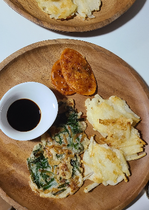 남편이 좋아하는 맛있는 장떡, 부추전, 제가 좋아하는 감자전을 만드는 방법은 다음과 같습니다. 우선 장떡은 차가운 물 적당량에 고추장과 부침가루를 넣고 잘 풀어주세요. 들러붙지 않는 프라이팬을 중간 불로 가열하고 식물성 기름 한 스푼을 추가합니다. 팬에 부침가루 반죽을 숟가락으로 떠서 부침개 모양으로 만든 후, 숟가락 뒷면으로 고르게 펴주세요. 장떡이 노릇 바삭해질 때까지 양면을 2~3분씩 조리합니다. 다 구워진 장떡을 종이 타월을 깐 접시에 옮겨 기름을 빼주세요. 맛있는 장떡이 완성되었습니다. 이어서 부추전은 부추를 깨끗이 씻은 후 엄지손가락 정도 길이로 잘라줍니다. 부침가루에 찬물을 부어 잘 섞어줍니다. 잘 풀어 준 부침가루에 부추와 소금과 후추를 조금 넣고 반죽의 농도는 약간 뻑뻑한 흐르지 않는 정도로 섞어줍니다. 프라이팬을 중간 불로 가열하고 기름을 넉넉히 둘러줍니다. 앞뒤로 노릇노릇하게 부쳐줍니다. 다 구워진 부추전을 종이 타월을 깐 접시에 옮겨 기름을 빼주세요. 맛있는 부추전이 완성되었습니다. 마지막으로 감자전의 요리방법입니다. 감자를 깨끗이 씻은 후 껍질을 벗겨줍니다. 껍질을 벗겨낸 감자를 약 1센티 두께로 직접 채 썰거나 또는 채칼을 이용하여 채 썰어줍니다. 부침가루에 찬물을 부어 잘 섞어줍니다. 잘 풀어 준 부침가루에 부추와 소금과 후추를 조금 넣고 반죽의 농도는 흐르지 않는 정도로 섞어줍니다. 프라이팬을 중간 불로 가열하고 기름을 넉넉히 둘러줍니다. 앞뒤로 노릇노릇하게 양면에 중간 갈색빛이 돌 때까지 바삭바삭하게 감자전을 부쳐줍니다. 다 구워진 감자전을 종이 타월을 깐 접시에 옮겨 기름을 빼주세요. 맛있는 감자전이 완성되었습니다. 장떡과 부추전, 감자전을 한 그릇에 담고 간장과 함께 드시면 짭짤하니 맛있게 즐길 수 있습니다.